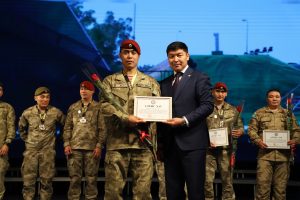 Осыған орай, қала әкімі Ернат Бәзіл батыл да қайсар 5514 әскери бөлімінің «Бүркіт» жасағының жауынгерлерін жеткен жетістіктерімен құттықтап, еліміздің көк туын әлем көгінде желбіреткен сарбаздардың ерен ерлігі көпке үлгі екендігін ерекше атап өтті.