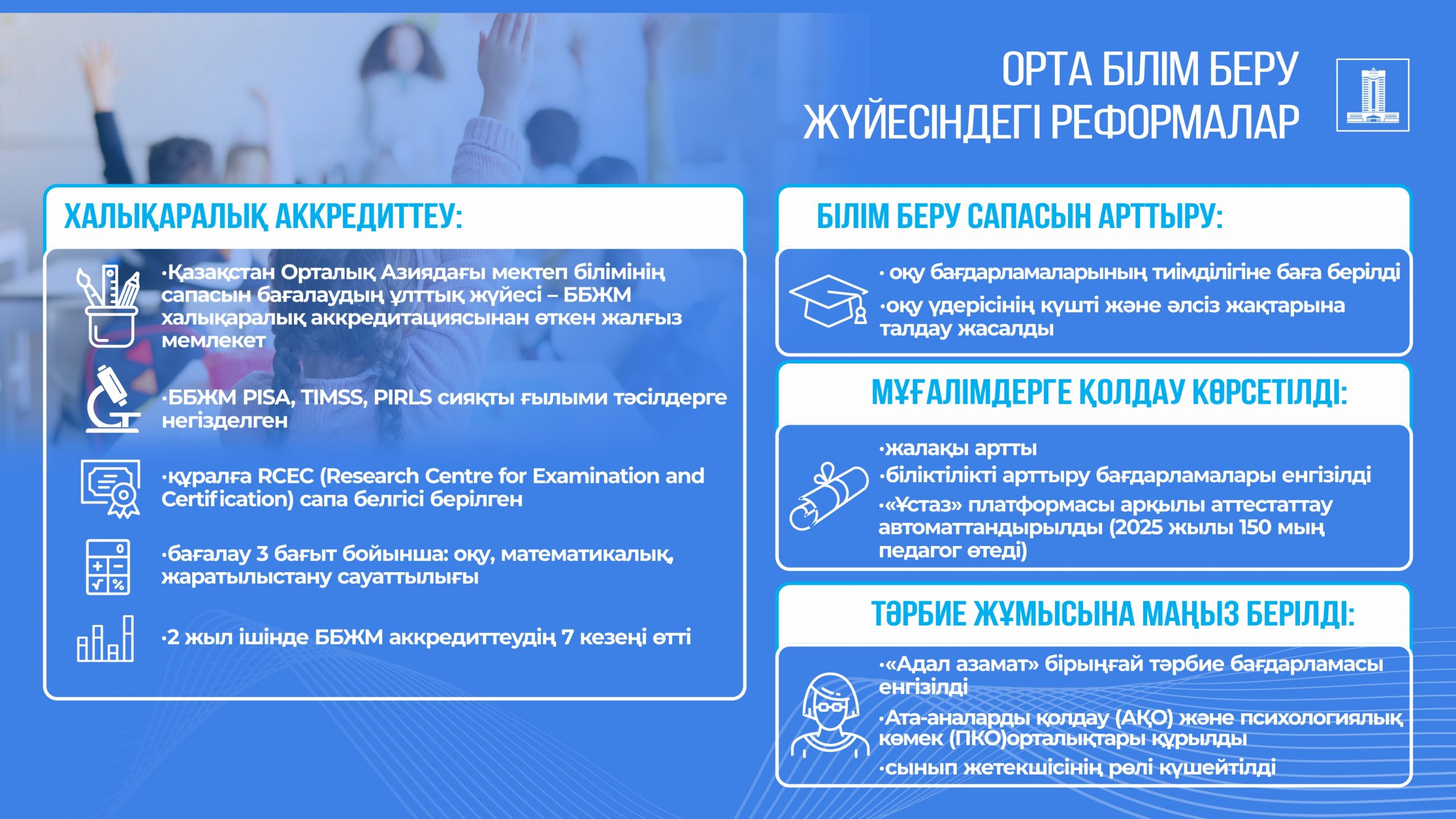 ⚡️ Соңғы жылдары Қазақстан білім сапасын арттыруға, оқушылар мен педагогтар үшін жағдайды жақсартуға, сондай-ақ қазіргі заманғы білім беру стандарттарын енгізуге бағытталған орта білім беру жүйесін жаңғырту бойынша ауқымды қадамдар жасауда.