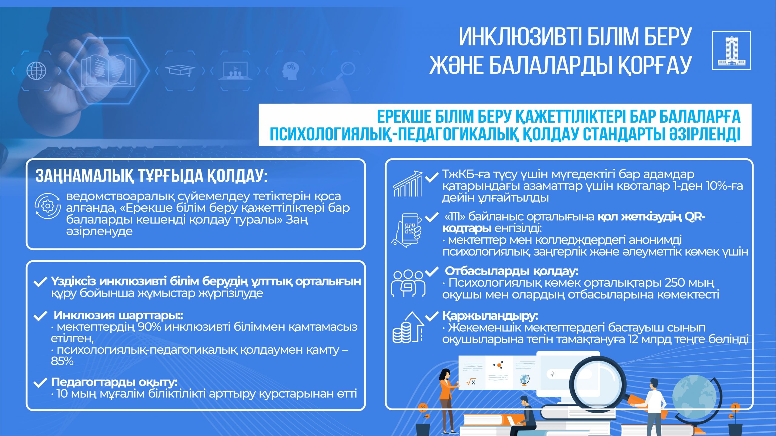 📌 Елімізде алғаш рет ерекше білім беру қажеттіліктері бар балаларды арнайы психологиялық-педагогикалық қолдау стандарты әзірленді. Мемлекеттік деңгейде білім берудің барлық деңгейлерінде ерекше білім беру қажеттіліктері бар балаларды сүйемелдеуге жүйелі тәсіл бекітіледі.