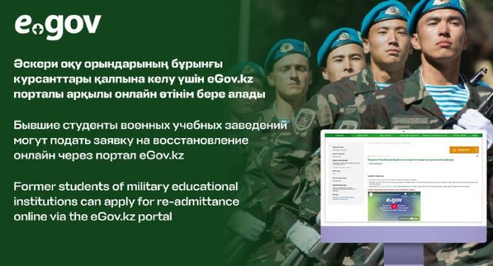 Әскери оқу орындарының бұрынғы курсанттары оқу орнына қайта түсу үшін үйден шықпай-ақ өтініш бере алады. Ол үшін eGov.kz порталы арқылы өтінім беру жеткілікті. Қызмет тегін көрсетіліп, кемінде бір семестр оқуды аяқтағандарға қолжетімді болады.