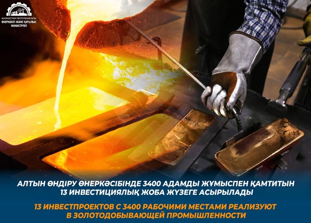 Алдағы үш жылда Қазақстанның алтын өндіру саласында жалпы құны 780 миллиард теңгені құрайтын 13 инвестициялық жобаны іске асыру жоспарланған. «QazIndustry» АҚ Жобаларды іске асыруға мониторинг жүргізу және талдау дирекциясы ақпараты бойынша аталмыш жобалар аясында 3400 жаңа жұмыс орны құрылатын болады.