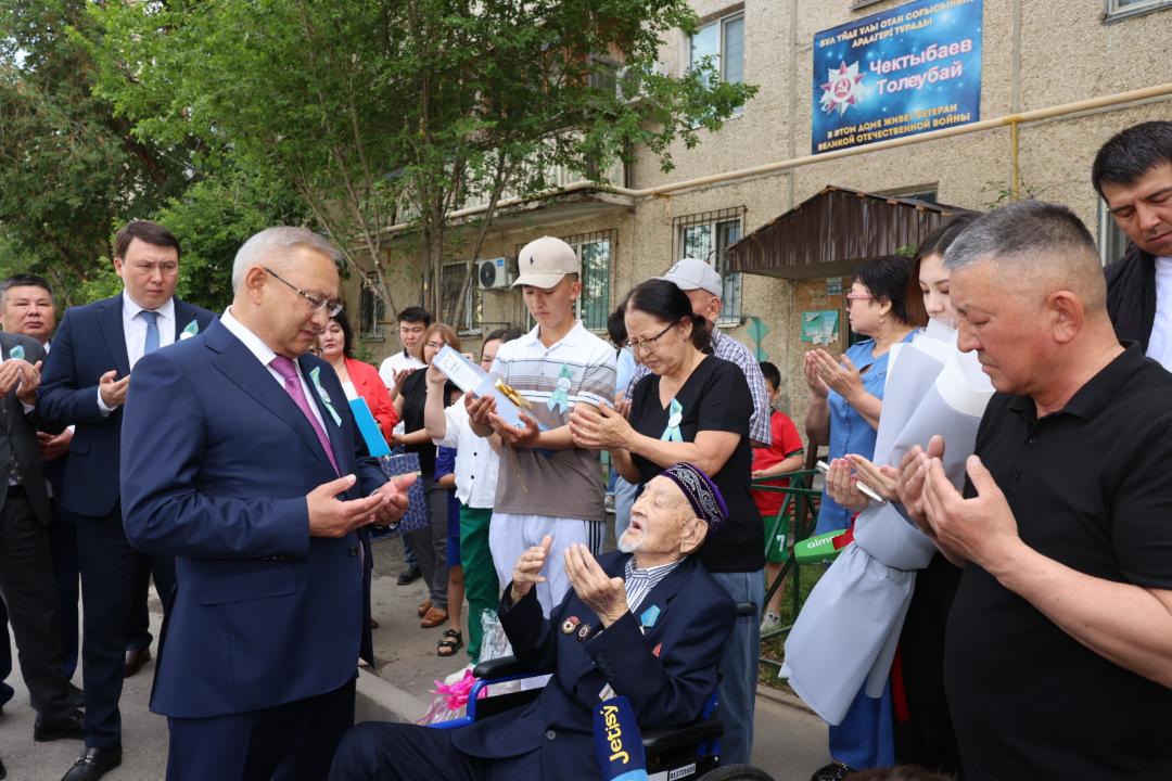 Мұнан соң өңір басшысы биыл 100 жасқа тоып отырған Төлеубай Шектібаев ақсақалдың шаңырағына барды. Майдан даласына 18 жасында аттанған Төлеубай ақсақал 1943-1944 жылдары Амур маңындағы қиыр шығыс шекарасын қорғаған екен. Мажарстандағы Балатон өзеніне дейін неміс басқыншыларынан азат ету ұрысына қатысқан. Ал 1945 жылы 83-ші атқыштар дивизиясының құрамында жапон әскеріне қарсы соққы беріп, Харбин қаласын азат етушілер қатарында болды. І дәрежелі Отан соғысы орденімен, «Ерлігі үшін» медалімен наградталды.