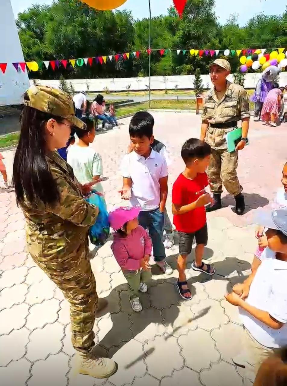 Сонымен қатар, балаларға тәтті-дәмділер мен балмұздақтар таратылып, арнайы дайындалған сыйлықтар үлестірілді. Шара барысында ата-аналар мен әскери қызметшілер де балалармен бірге белсене қатысып, ортақ қуанышқа бөленді.