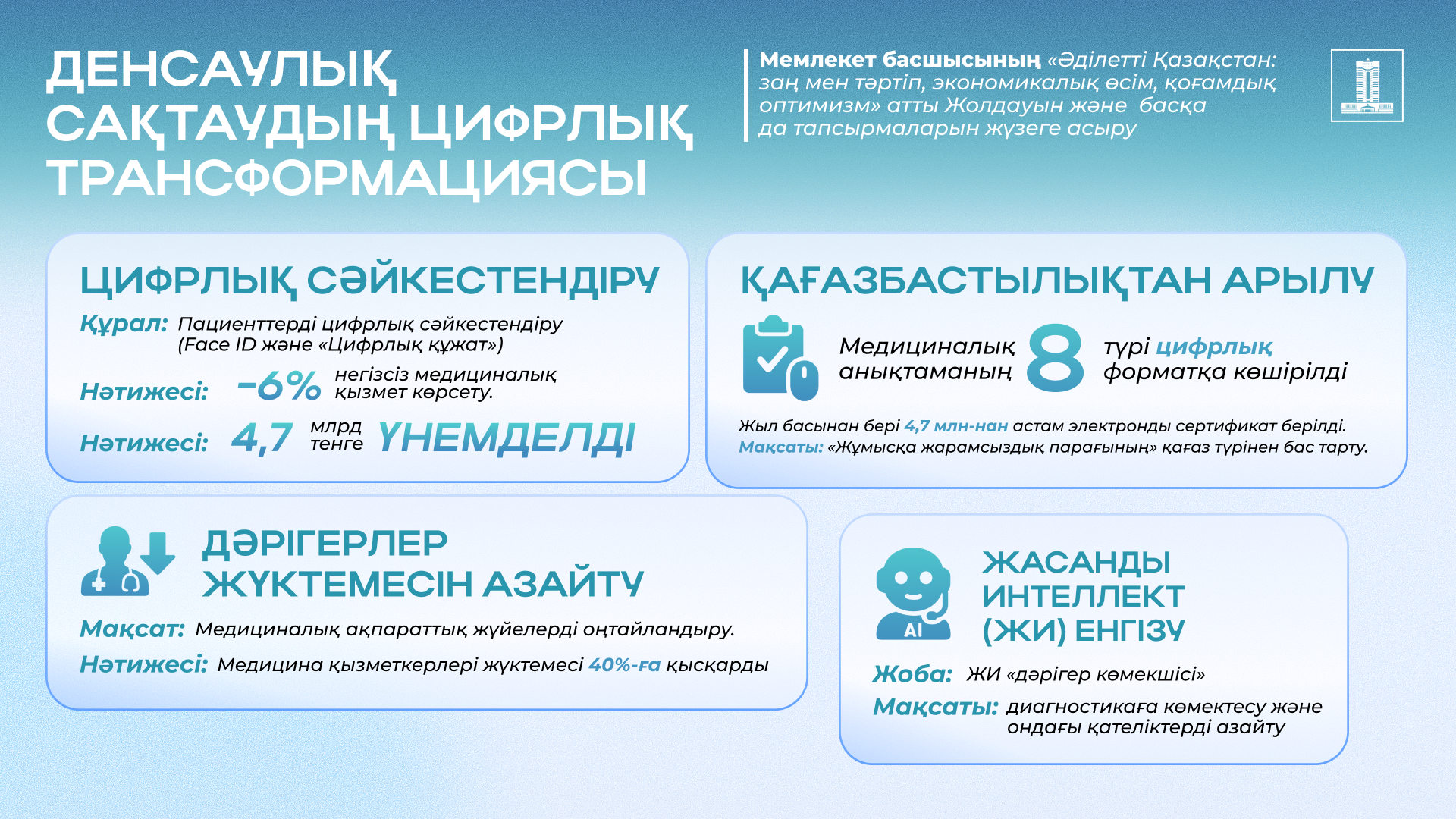 Президенттің «Әділетті Қазақстан: заң мен тәртіп, экономикалық өсім, қоғамдық оптимизм» атты Қазақстан халқына Жолдауын және өзге де тапсырмаларын жүзеге асыру шеңберінде Үкімет Денсаулық сақтау министрлігі тарапынан халыққа медициналық қызметтердің сапасы мен қолжетімділігін арттыру бойынша жұмыстар жүргізуде.