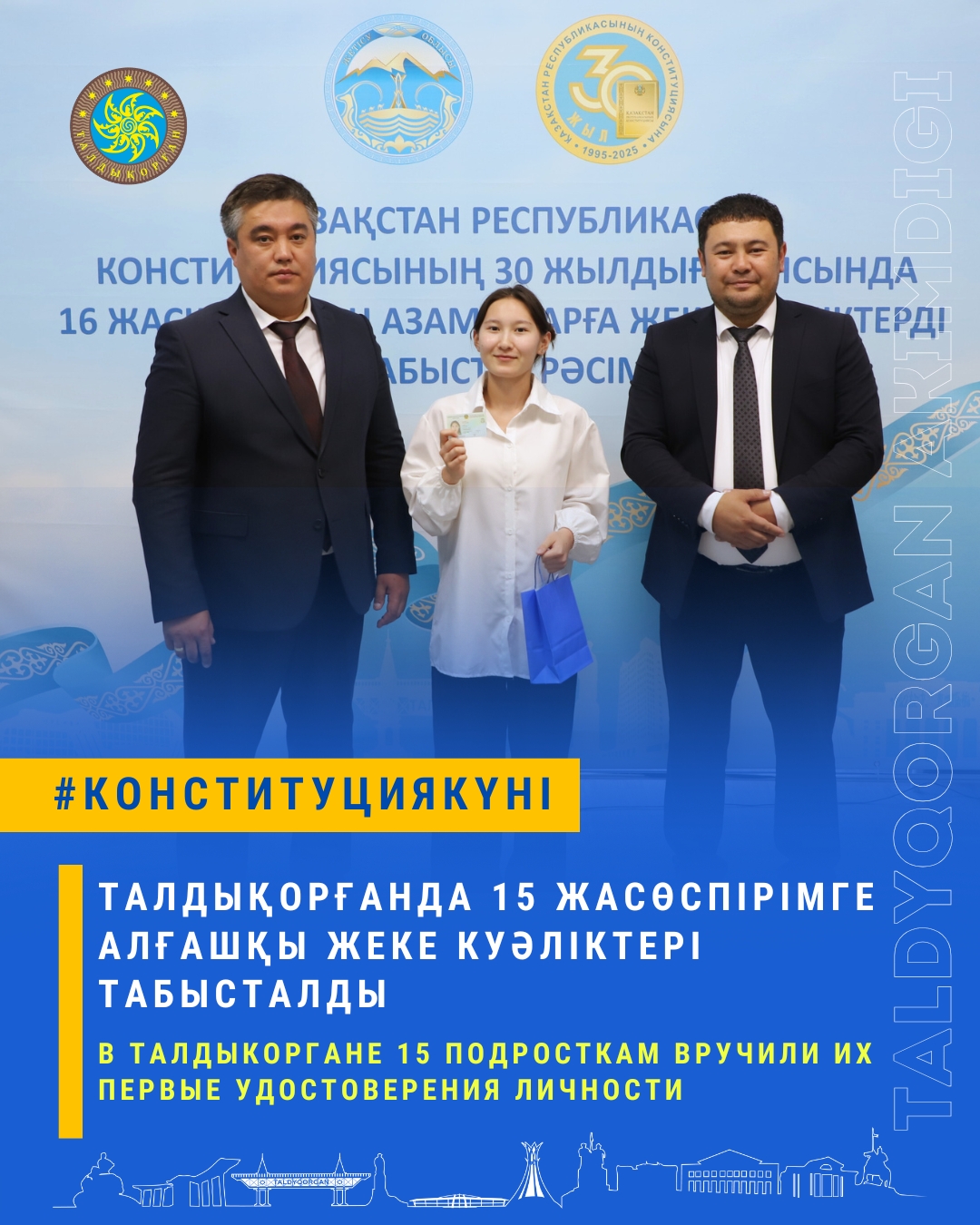 Талдықорған қаласындағы Халыққа қызмет көрсету орталығында ҚР Конституциясының 30 жылдығына орай салтанатты іс-шара өтті. Шара барысында 16 жасқа толған 15 жасөспірімге алғашқы жеке куәліктері табысталды.