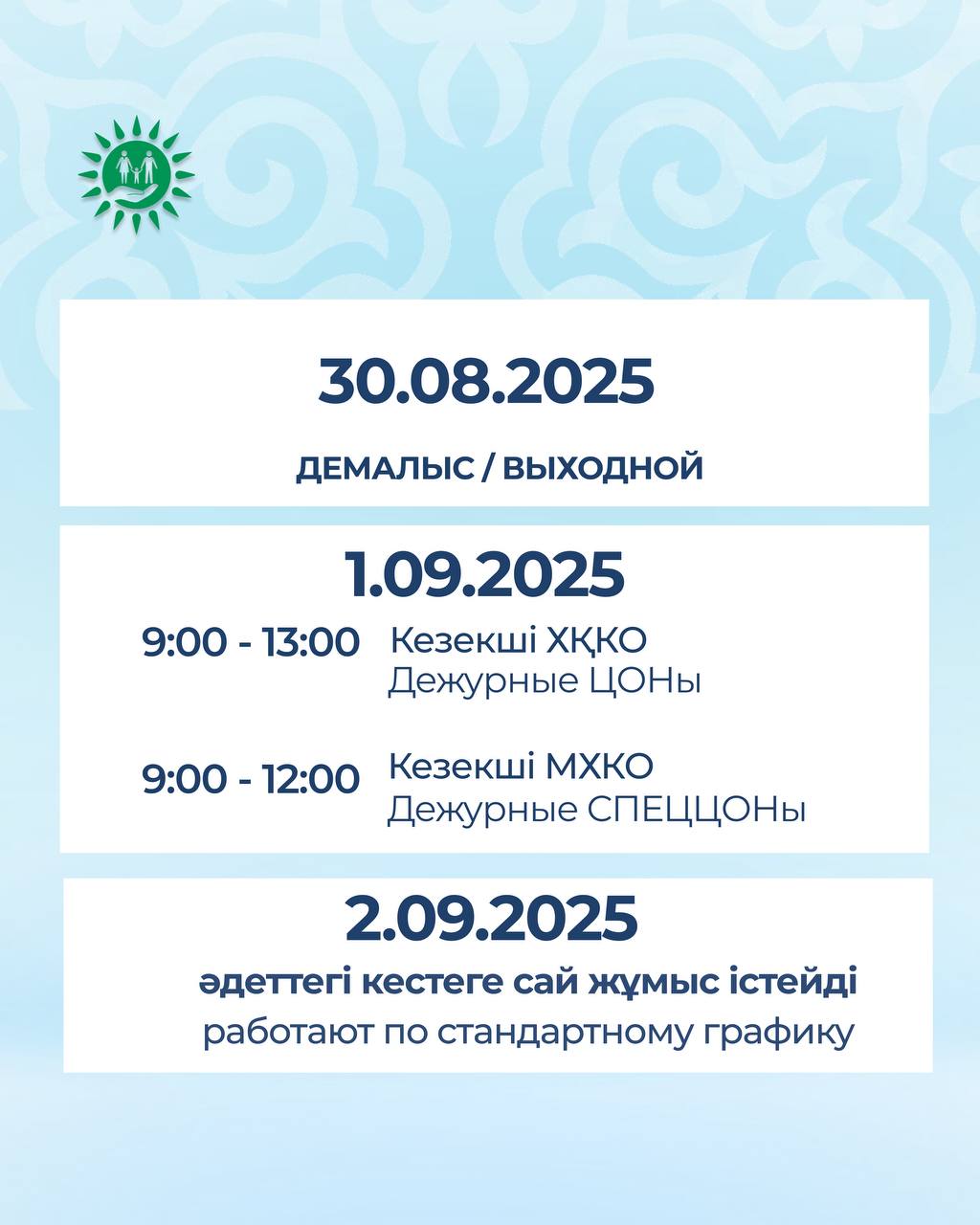 1 қыркүйек, дүйсенбі күні тек кезекші орталықтар мен кезекші мамандандырылған орталықтар қызмет көрсетеді. Кезекші орталықтар 9:00-ден 13:00-ге дейін, ал мамандандырылған орталықтар 9:00-ден 12:00-ге дейін жұмыс істеп, дайын құжаттарды 13:00-ге дейін береді.
