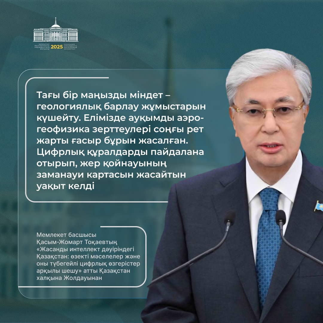 ЖаңалықтарҚоғамдық сананы жаңғырту Тағы бір маңызды міндет — геологиялық барлау жұмыстарын күшейту арқылы Назерке Әділбекова - 08.09.2025 176 Facebook-те бөлісіңіз Твиттерде твит