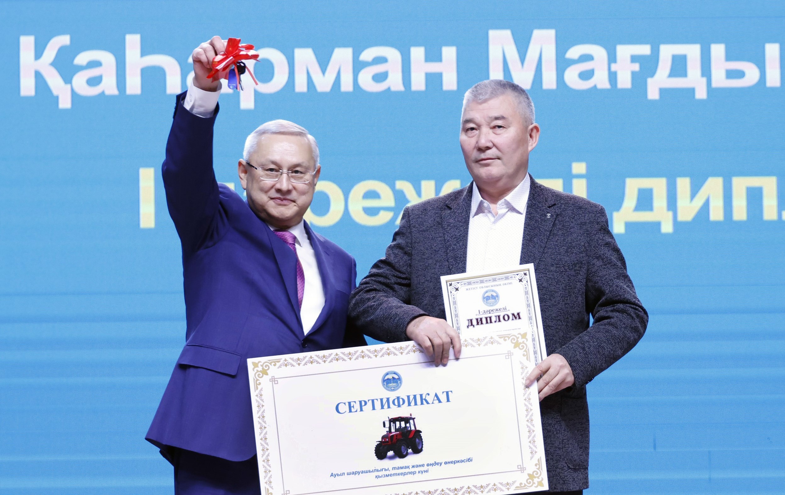 — Бұл күн – елдің азық-түлік қауіпсіздігінқамтамасыз етіп, еліміздің әлеуметтік-экономикалық дамуына зор үлес қосып жүрген еңбек адамдарына деген құрметтің белгісі. Біздің алдымызда облыстағы ауыл шаруашылығының жалпы өнімін арттырып, агроөнеркәсіп кешенін цифрландыру және оны жоғары технологияға негізделген сала ретінде дамыту міндеті тұр. Биыл агросубъектілерді қолдауға мемлекет тарапынан 61,2 млрд. теңге қаражат бөлінді, оның 25,2 млрд. теңгесі — субсидия, 24 млрд. теңге — жеңілдетілген кредиттер, 12 млрд теңге — лизингтік бағдарламалар. Соның нәтижесінде жаңа ауыл шаруашылығы техникасы алынып, машина трактор паркі жаңартылуда. Су үнемдеу технологиясы енгізіліп жатыр. Биыл облыс диханшыларының қажырлы еңбектерінің арқасында 2,0 млн.тонна ауыл шаруашылық дақылдары жиналды. Кәсіби мерекелеріңізбен құттықтай отырып, адал еңбектеріңіз үшін ризашылығымызды білдіреміз, — деді Бейбіт Исабаев. Мұнан кейін жиын марапаттау рәсімімен жалғасты.