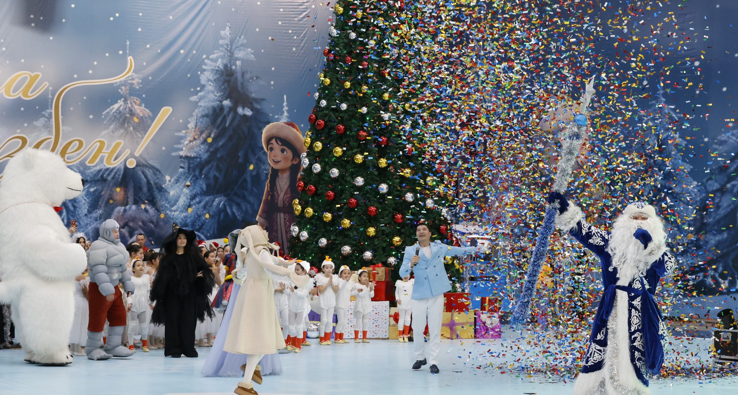 Мерекелік шара барысында Аяз ата мен Ақшақар балалар үшін жаңа жылдық шыршаны жарқырата жақты. Цирк әртістері, аниматорлар, қазақ халық ертегілері мен мультфильм кейіпкерлері өнер көрсетіп, мерекеге ерекше рең берді.