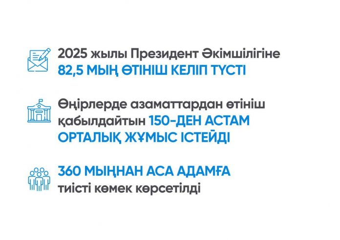 2025 жылы Президент Әкімшілігіне 82,5 мың өтініш келіп түсті. Бүгінде азаматтардың талап-тілегін сапалы қарау үшін eOtinish жүйесінде толық цифрлық инфрақұрылым жасақталды. Оған 50 мың ұйым және 320 мың қызметкер қосылды.