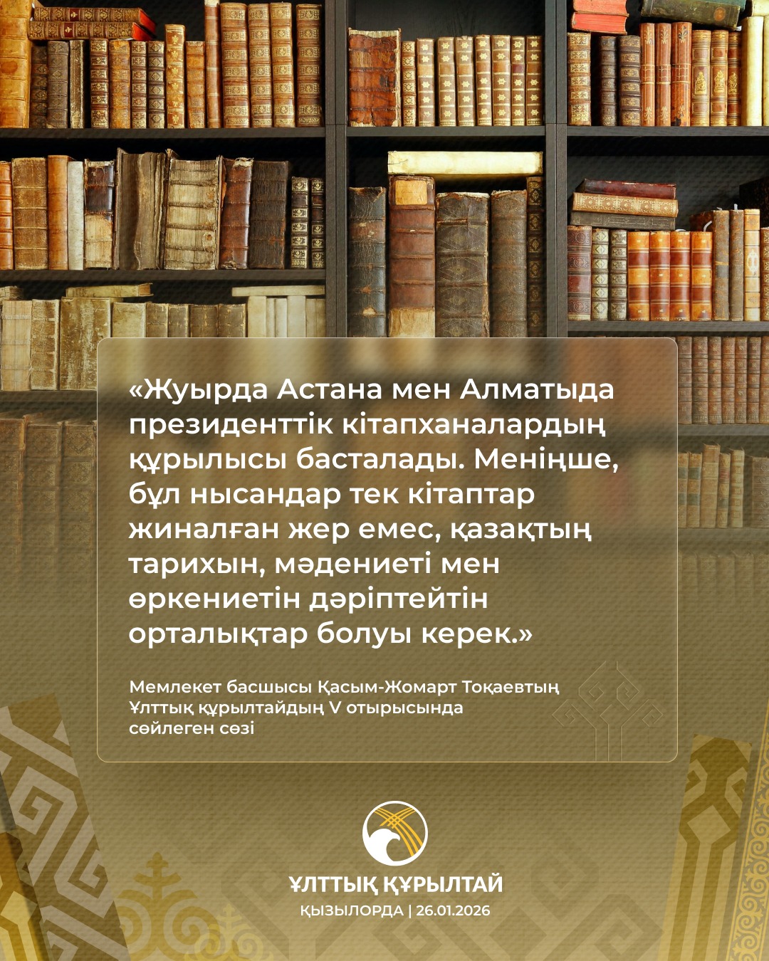 Ұлттық құрылтайдың Үшінші отырысында Мемлекет басшысы қоғамда оқу мәдениетін қалыптастыру туралы бастама көтеріп, 23 сәуір – Ұлттық кітап күні болып бекітілген болатын. Ал, бүгінгі жиында Алматы мен Астанада президенттік кітапханалардың құрылысы басталатындығын тілге тиек етті. Әбіш Кекілбаев “Адамды адам еткен-кітап, адамзат еткен –кітапхана” дейді. Өткеніміз бен бүгінімізден, өркениетімізден сыр шертер рухани байлықтың бастауы осынау асыл қазынамыз өзінің құндылығын жоғалтқан да, жоғалтпақ та емес. Оған тағы бір мәрте көзіміз жеткендей болды. Тарихымыз бен мәдениетімізді дәріптер нысандар қатары арта берсін.