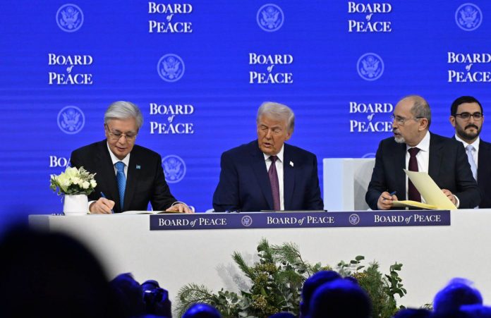 ЖаңалықтарҚоғамдық сананы жаңғырту Мемлекет басшысы Қасым-Жомарт Тоқаев АҚШ Президенті Дональд Трамптың бастамасымен құрылған Бейбітшілік кеңесінің Жарғысына қол қойды арқылы Назерке Әділбекова - 22.01.2026 4 Facebook-те бөлісіңіз Твиттерде твит Мемлекет басшысы Қасым-Жомарт Тоқаев АҚШ Президенті Дональд Трамптың бастамасымен құрылған Бейбітшілік кеңесінің Жарғысына қол қойды Қол қою рәсіміне Қазақстан Президентінен басқа 18 елдің басшылары мен өкілдері қатысты.