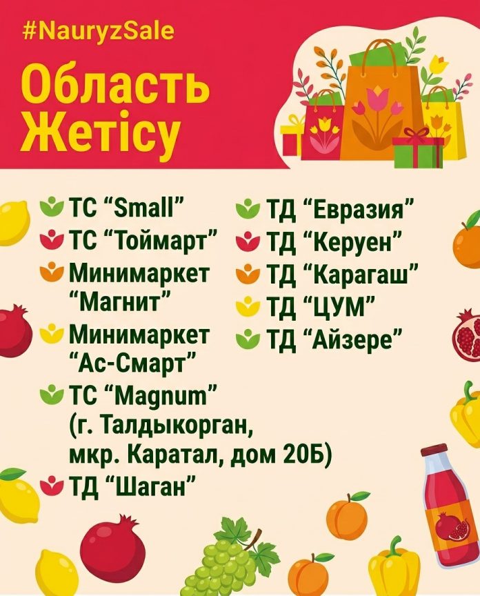Жетісу облысында акцияға ірі сауда желілері мен сауда үйлері белсенді түрде қосылды: «TOIMART», «SMALL», «Magnum» (мкр. Қаратал, 20Б үй), «Шаған», «Еуразия», «Керуен», «Қарағаш», «ЦУМ», «Айзере», сондай-ақ минимаркеттер «Magnit» және «As-mart». Аймақ тұрғындары акцияның барлық артықшылықтарын пайдалана отырып, сапалы өнімдерді қолжетімді бағамен сатып алып, қазақстандық өндірушілерді қолдай алады.