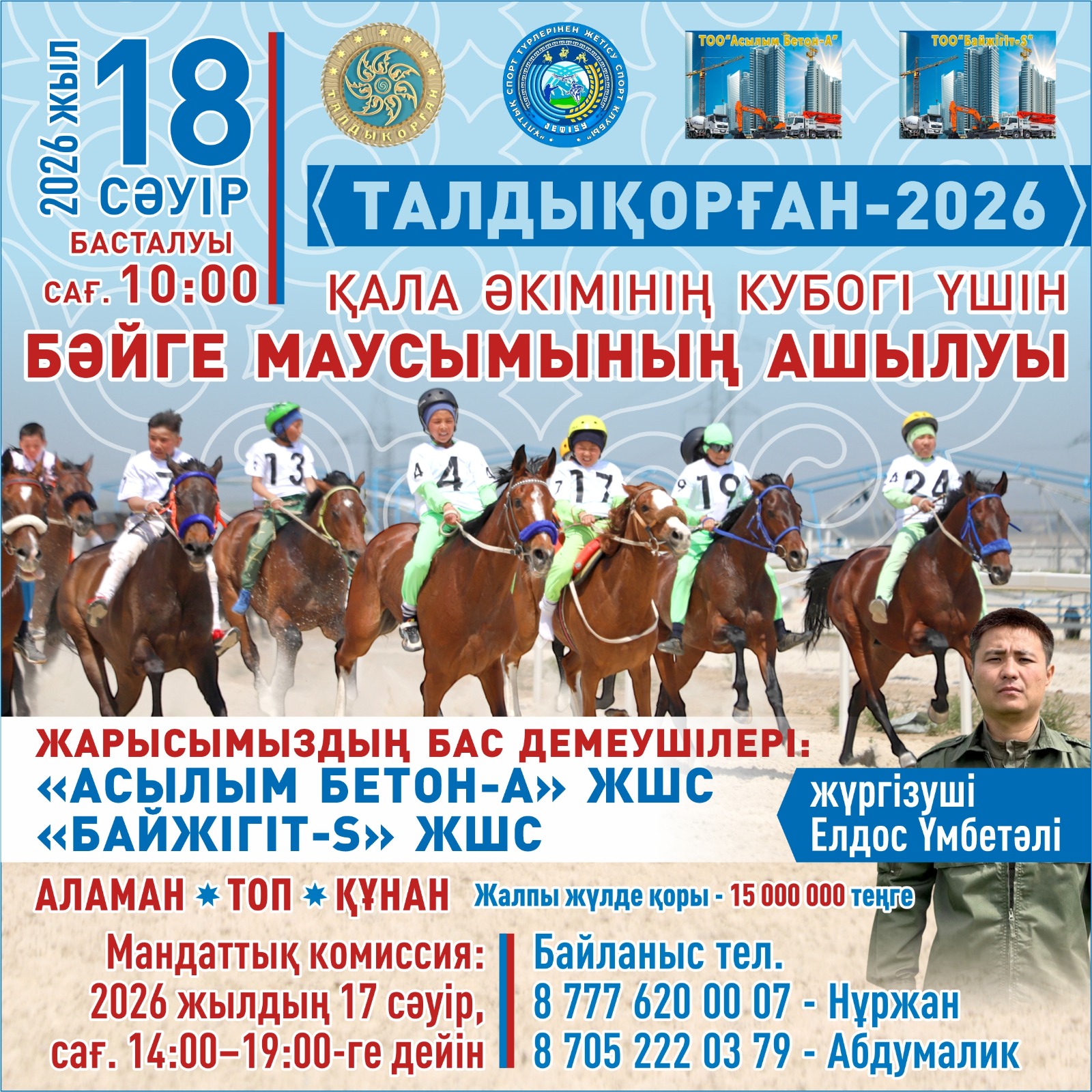 Сіздерді Талдықорған қаласының ұлттық спорт жанашырларының ұйымдастыруымен және қала әкімдігінің қолдауымен өтетін «Талдықорған – 2026» бәйге маусымының ашылу салтанатына шақырамыз!