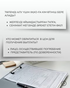 ЖаңалықтарҚоғамдық сананы жаңғырту Жерлеуге арналған төлемдерді қалай алуға болады? арқылы Назерке Әділбекова - 29.04.2026 3 Facebook-те бөлісіңіз Твиттерде твит Жерлеуге арналған төлемді қалай рәсімдеу керектігін айтамыз. Қайда жүгіну қажет және мемлекеттен көмек алу үшін қандай құжаттарды дайындау керек, сондай-ақ өтініш беру кезіндегі маңызды тұстарды атап өтеміз.
